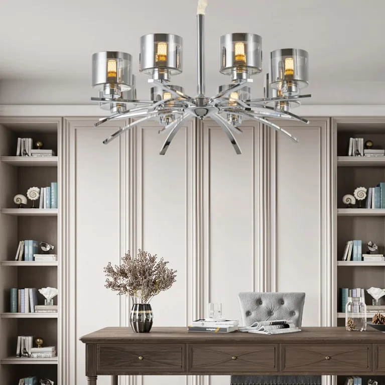 Преобладающий цвет плафонов: Дымчатый, арматуры: Никель; материал изготовления арматуры: Металл, размеры, мм: длина 430 / высота 430 / диаметр 800. Общая мощность – 320 Ватт. Основной тип ламп, предусмотренный производителем: Накаливания с цоколем E27. В зависимости от предпочтений можно использовать лампы теплового, холодного или нейтрального света, за исключением люстр с типом цоколя LED.