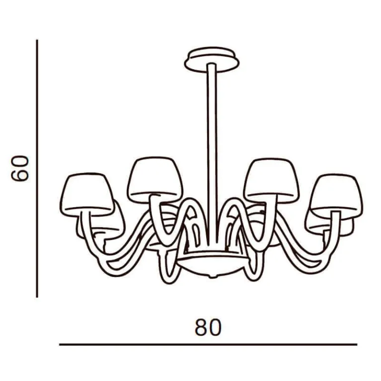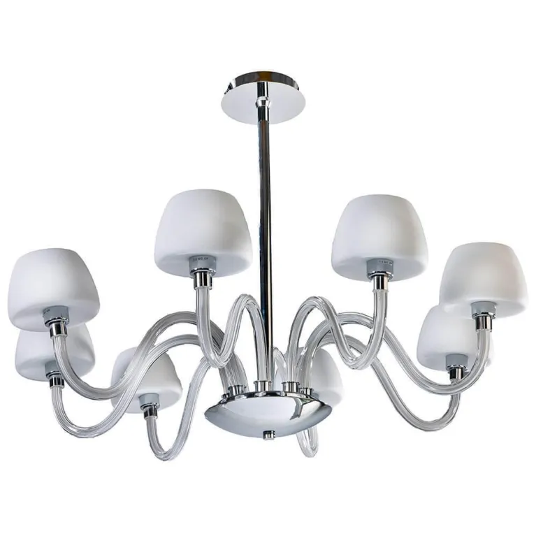 Преобладающий цвет люстры: Белый, плафонов: Белый, арматуры: Хром; материал изготовления арматуры: Металл, размеры, мм: / высота 600 / диаметр 800. Общая мощность – 320 Ватт. Основной тип ламп, предусмотренный производителем: Накаливания с цоколем E14. В зависимости от предпочтений можно использовать лампы теплового, холодного или нейтрального света, за исключением люстр с типом цоколя LED.