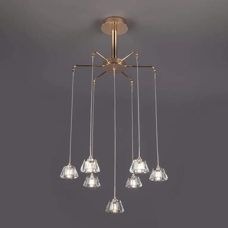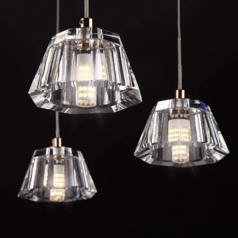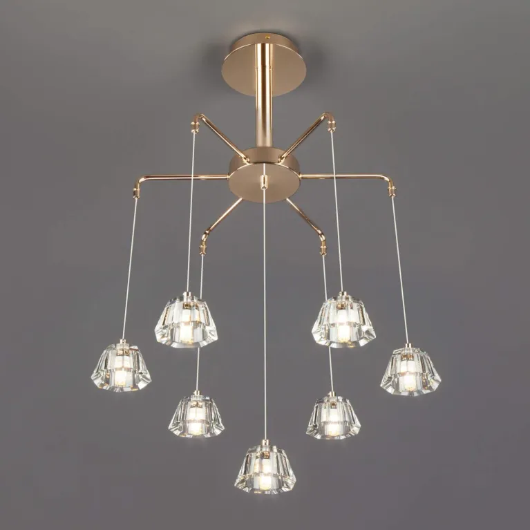 Преобладающий цвет люстры: Золотой, плафонов: Прозрачный, арматуры: Золото; материал изготовления арматуры: Металл, размеры, мм: / высота 700 / диаметр 430. Общая мощность – 42 Ватт, а максимальная площадь освещения до 6 м2. Основной тип ламп, предусмотренный производителем: Светодиодная с цоколем G4. В зависимости от предпочтений можно использовать лампы теплового, холодного или нейтрального света, за исключением люстр с типом цоколя LED.
