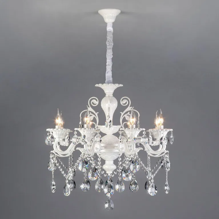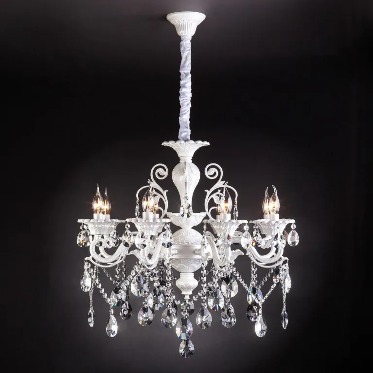 Преобладающий цвет люстры: Белый, арматуры: Белый; материал изготовления арматуры: Металл, размеры, мм: / высота 680 / диаметр 685. Общая мощность – 480 Ватт, а максимальная площадь освещения до 38 м2. Основной тип ламп, предусмотренный производителем: Накаливания с цоколем E14. В зависимости от предпочтений можно использовать лампы теплового, холодного или нейтрального света, за исключением люстр с типом цоколя LED.