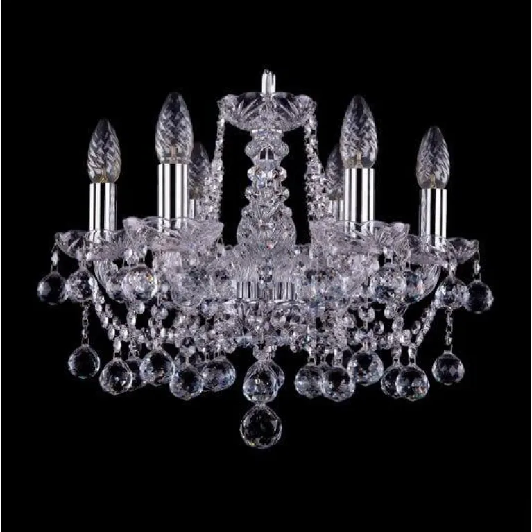 Люстра изготовлена из прочного металла и имеет никелевое покрытие, придающее ей современный и стильный вид. Плафоны выполнены из высококачественного хрусталя, который прекрасно рассеивает свет и создает мягкое, приятное для глаз освещение. В светильнике используется патрон для ламп с цоколем E14, что позволяет использовать как традиционные лампы накаливания, так и энергосберегающие светодиодные.
