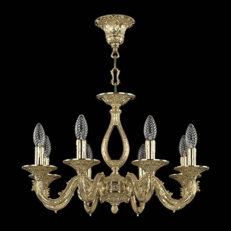 Люстра изготовлена из прочного металла и имеет покрытие золотого цвета, что придаёт ей роскошный и утонченный вид. Она оснащена восемью источниками света с цоколем E14, что позволяет использовать различные типы ламп, включая энергосберегающие и светодиодные. Суммарная мощность ламп — 320 Вт, что обеспечивает яркое и равномерное освещение пространства площадью до 16 квадратных метров.
