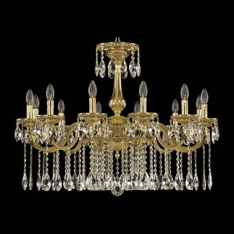 Люстра выполнена из высококачественного металла и имеет изысканное гальваническое покрытие золотого цвета. Она оснащена двенадцатью лампами, что обеспечивает яркое и равномерное освещение пространства площадью до 96 кв.м. Патрон E14 позволяет использовать лампы мощностью до 40 Вт, что гарантирует долгий срок службы светильника.