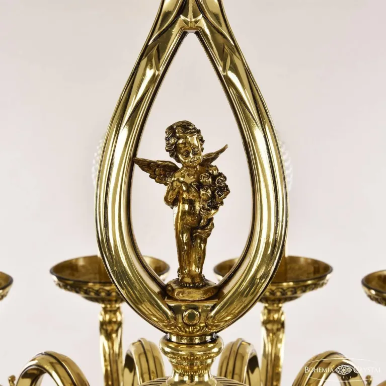 Плафоны выполнены в виде тонких изогнутых лепестков, изготовленных из полупрозрачного стекла. Они придают люстре лёгкость и воздушность, делая её стильной и современной. Основание имеет лаконичное матовое золото покрытие, которое прекрасно гармонирует с хрустальными элементами.