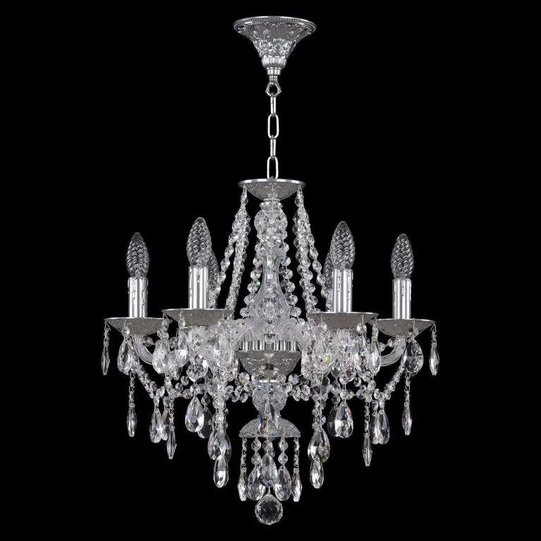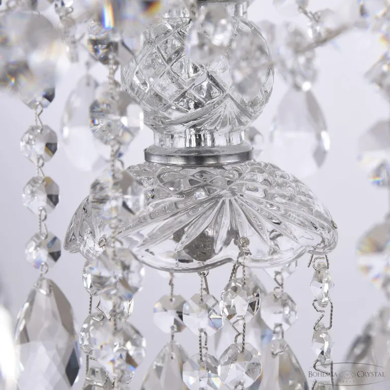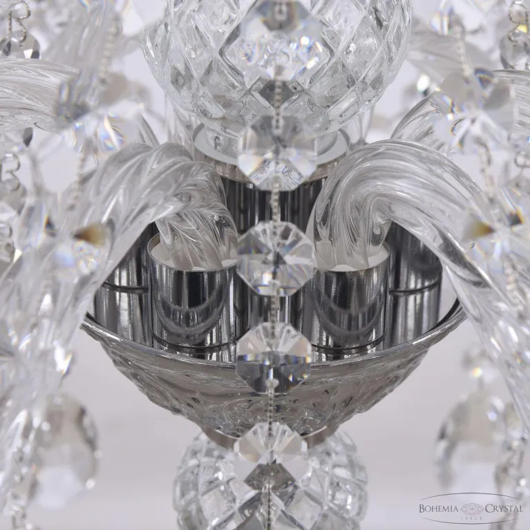 Люстра изготовлена из прочного хрусталя и металла, что придает ей роскошный и утонченный вид. Она имеет 8 рожков, что гарантирует яркое и равномерное освещение пространства. Суммарная мощность ламп может составлять до 420 Вт [1], что делает эту модель подходящей для просторных помещений с высокими потолками.