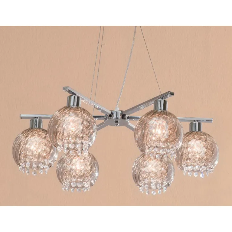 Преобладающий цвет люстры: Хром, плафонов: Прозрачный, арматуры: Хром; материал изготовления арматуры: Металл, размеры, мм: / высота 300 / диаметр 680. Общая мощность – 360 Ватт, а максимальная площадь освещения до 20 м2. Основной тип ламп, предусмотренный производителем: Накаливания с цоколем E27. В зависимости от предпочтений можно использовать лампы теплового, холодного или нейтрального света, за исключением люстр с типом цоколя LED.