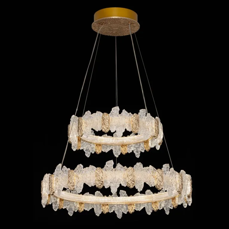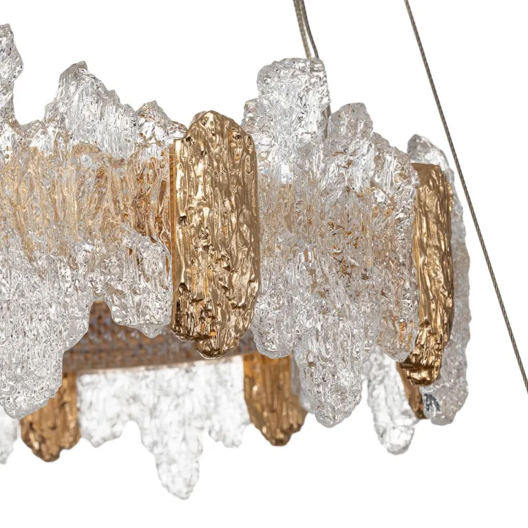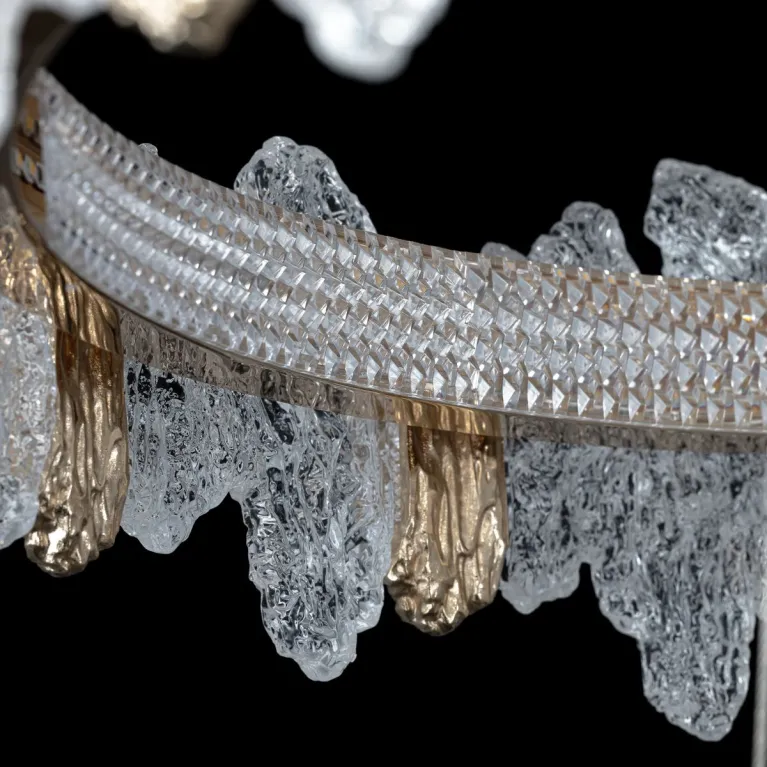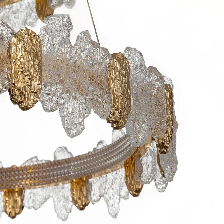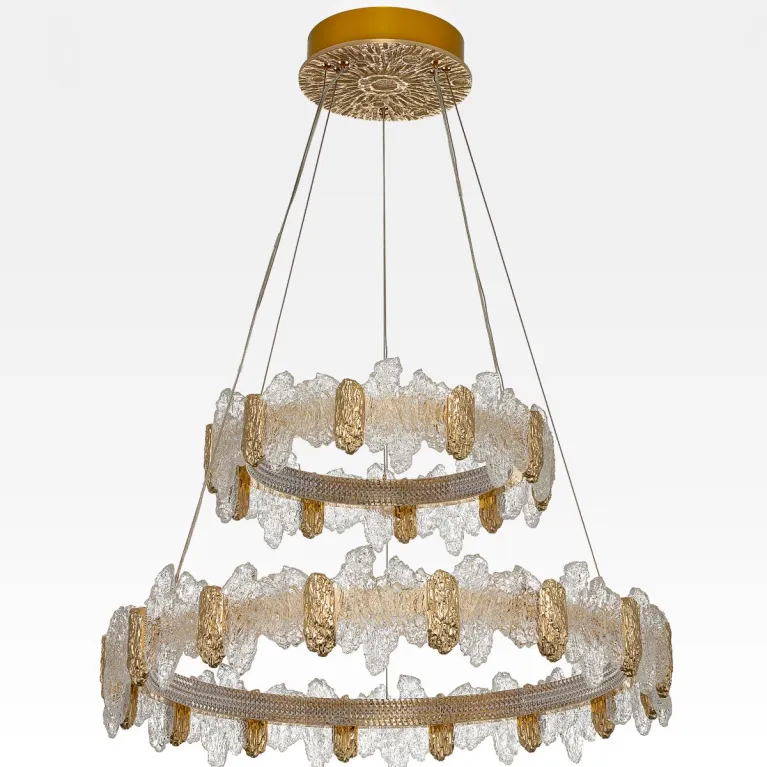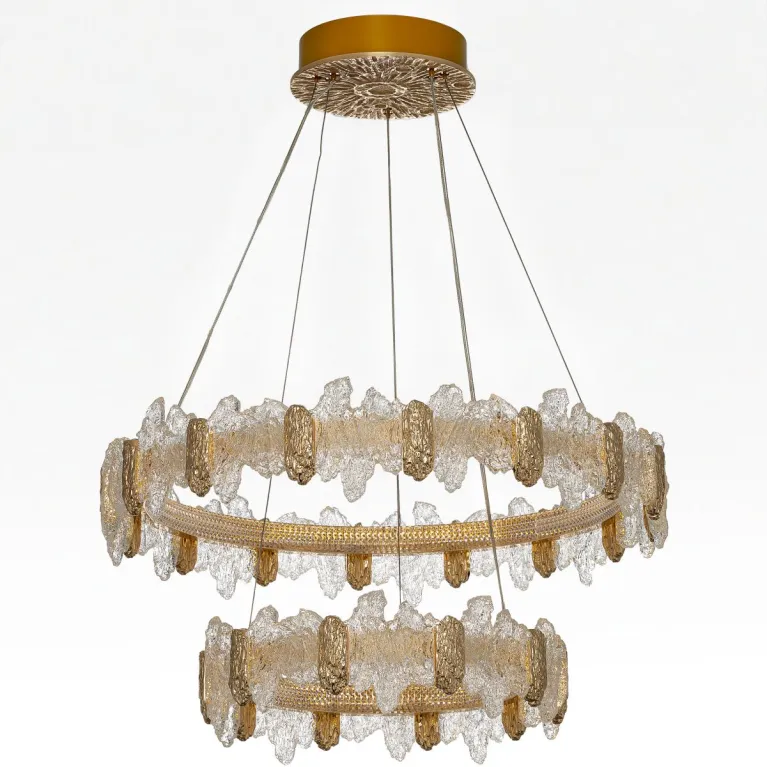 Преобладающий цвет плафонов: Разноцветный, арматуры: Золото; материал изготовления арматуры: Металл, размеры, мм: / высота 2000 / диаметр 750. Общая мощность – 140 Ватт. Основной тип ламп, предусмотренный производителем: Светодиодная с цоколем LED. В зависимости от предпочтений можно использовать лампы теплового, холодного или нейтрального света, за исключением люстр с типом цоколя LED.