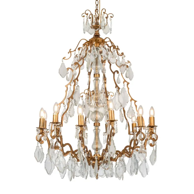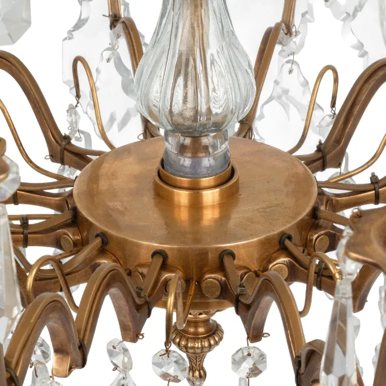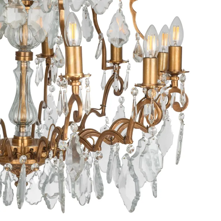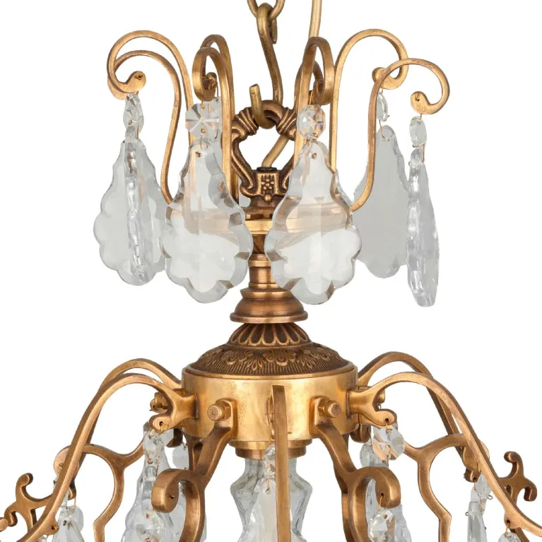 Преобладающий цвет арматуры: Латунь; материал изготовления арматуры: Металл, размеры, мм: / высота 1050 / диаметр 790. Общая мощность – 480 Ватт. Основной тип ламп, предусмотренный производителем: Накаливания с цоколем E14. В зависимости от предпочтений можно использовать лампы теплового, холодного или нейтрального света, за исключением люстр с типом цоколя LED.