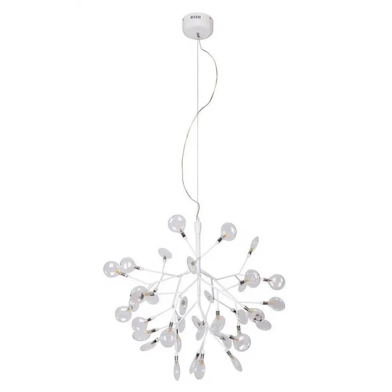 Преобладающий цвет люстры: Белый, плафонов: Прозрачный, арматуры: Белый; материал изготовления арматуры: Металл, размеры, мм: / высота 600 / диаметр 720. Общая мощность – 36 Ватт, а максимальная площадь освещения до 15 м2. Основной тип ламп, предусмотренный производителем: Светодиодная с цоколем G4. В зависимости от предпочтений можно использовать лампы теплового, холодного или нейтрального света, за исключением люстр с типом цоколя LED.