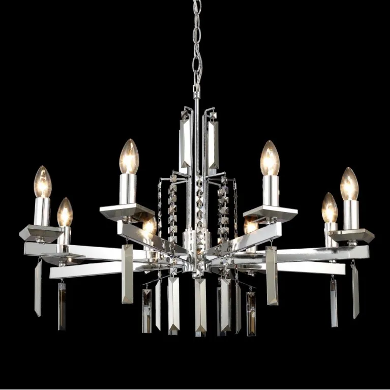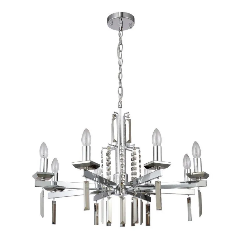 Преобладающий цвет люстры: Хром, арматуры: Хром; материал изготовления арматуры: Металл, размеры, мм: / высота 510 / диаметр 710. Общая мощность – 480 Ватт. Основной тип ламп, предусмотренный производителем: Накаливания с цоколем E14. В зависимости от предпочтений можно использовать лампы теплового, холодного или нейтрального света, за исключением люстр с типом цоколя LED.