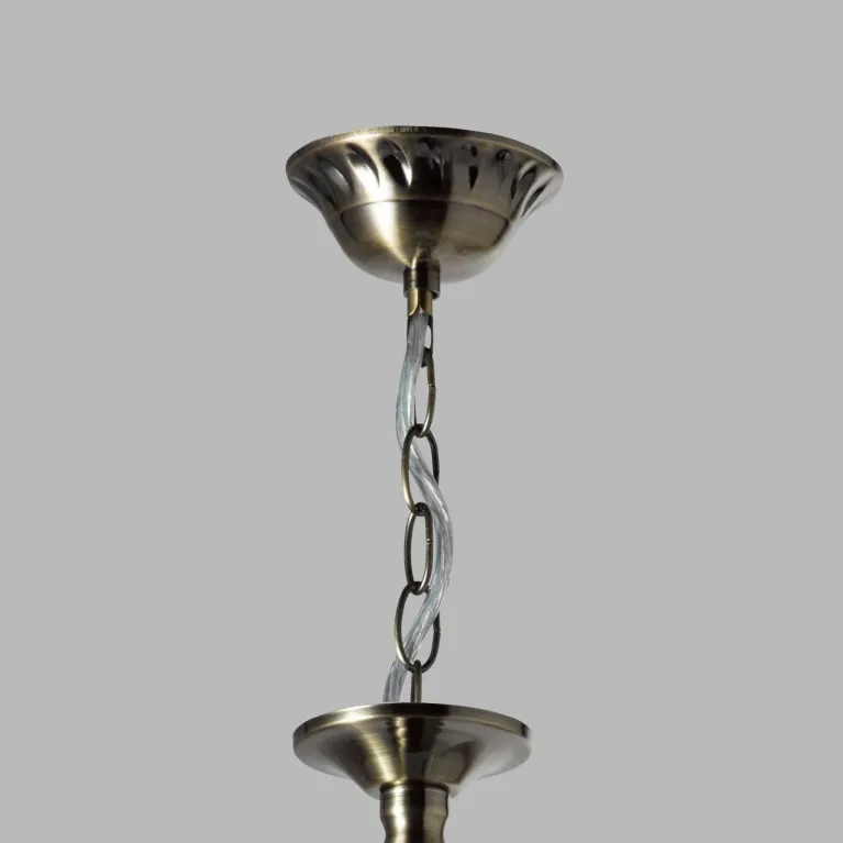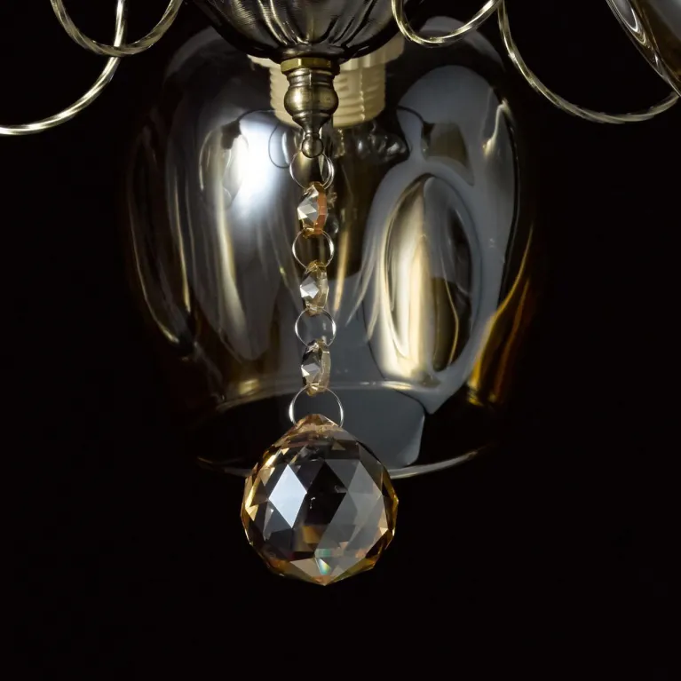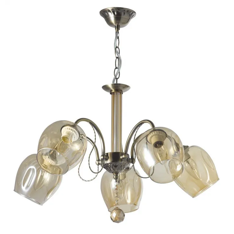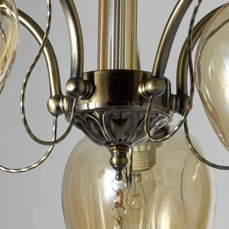 Преобладающий цвет люстры: Шампань, плафонов: Шампань, арматуры: Античная бронза; материал изготовления арматуры: Металл, размеры, мм: / высота 650 / диаметр 610. Общая мощность – 200 Ватт, а максимальная площадь освещения до 15 м2. Основной тип ламп, предусмотренный производителем: Накаливания с цоколем E27. В зависимости от предпочтений можно использовать лампы теплового, холодного или нейтрального света, за исключением люстр с типом цоколя LED.