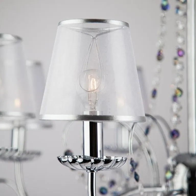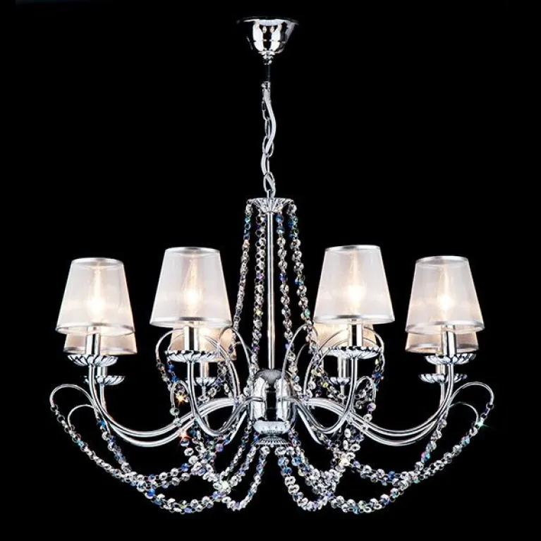 Преобладающий цвет люстры: Серебро, плафонов: Серебро, арматуры: Хром; материал изготовления арматуры: Металл, размеры, мм: / высота 542 / диаметр 800. Общая мощность – 320 Ватт, а максимальная площадь освещения до 17,8 м2. Основной тип ламп, предусмотренный производителем: Накаливания с цоколем E14. В зависимости от предпочтений можно использовать лампы теплового, холодного или нейтрального света, за исключением люстр с типом цоколя LED.