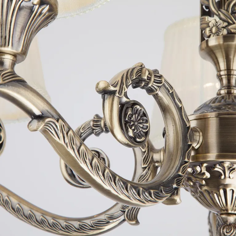 Преобладающий цвет люстры: Белый, плафонов: Белый, арматуры: Бронза; материал изготовления арматуры: Металл, размеры, мм: / высота 460 / диаметр 620. Общая мощность – 200 Ватт, а максимальная площадь освещения до 11,1 м2. Основной тип ламп, предусмотренный производителем: Накаливания с цоколем E14. В зависимости от предпочтений можно использовать лампы теплового, холодного или нейтрального света, за исключением люстр с типом цоколя LED.