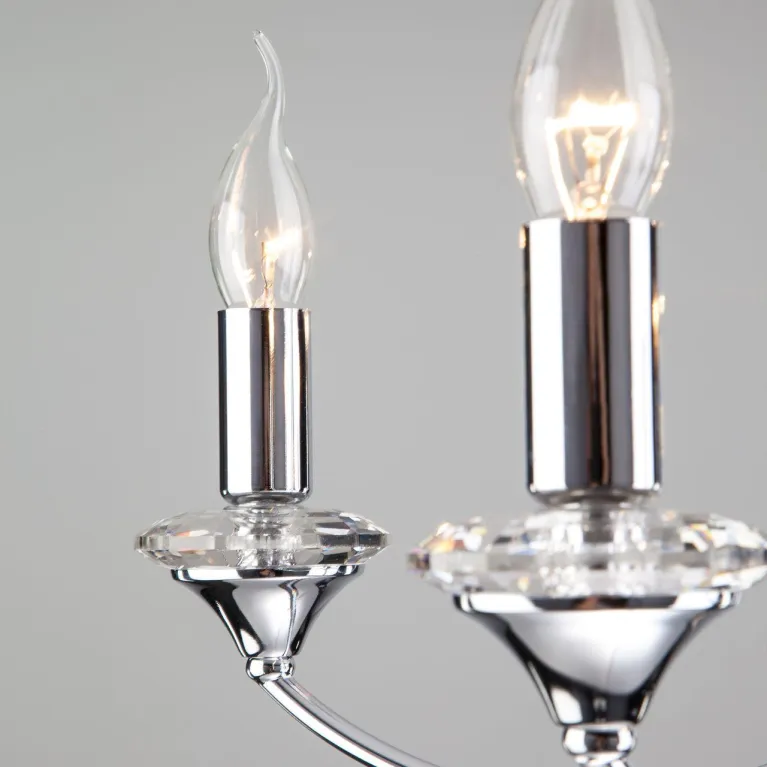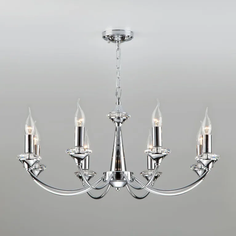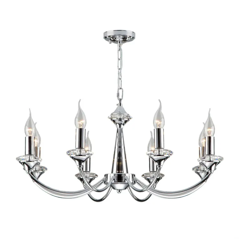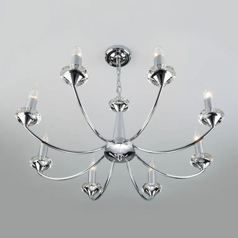 Преобладающий цвет люстры: Хром, арматуры: Хром; материал изготовления арматуры: Металл, размеры, мм: / высота 330 / диаметр 700. Общая мощность – 480 Ватт, а максимальная площадь освещения до 36 м2. Основной тип ламп, предусмотренный производителем: Накаливания с цоколем E14. В зависимости от предпочтений можно использовать лампы теплового, холодного или нейтрального света, за исключением люстр с типом цоколя LED.