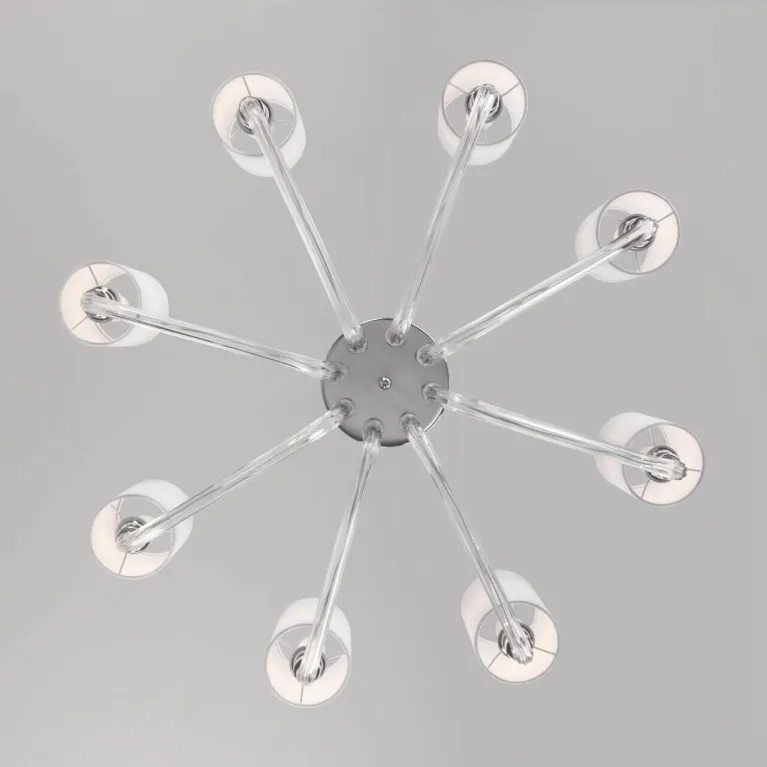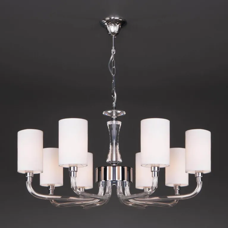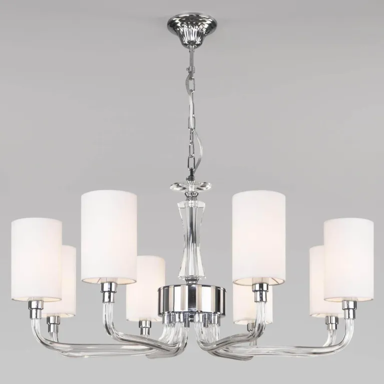 Преобладающий цвет люстры: Белый, плафонов: Белый, арматуры: Хром; материал изготовления арматуры: Металл, размеры, мм: / высота 360 / диаметр 800. Общая мощность – 320 Ватт, а максимальная площадь освещения до 21 м2. Основной тип ламп, предусмотренный производителем: Накаливания с цоколем E14. В зависимости от предпочтений можно использовать лампы теплового, холодного или нейтрального света, за исключением люстр с типом цоколя LED.