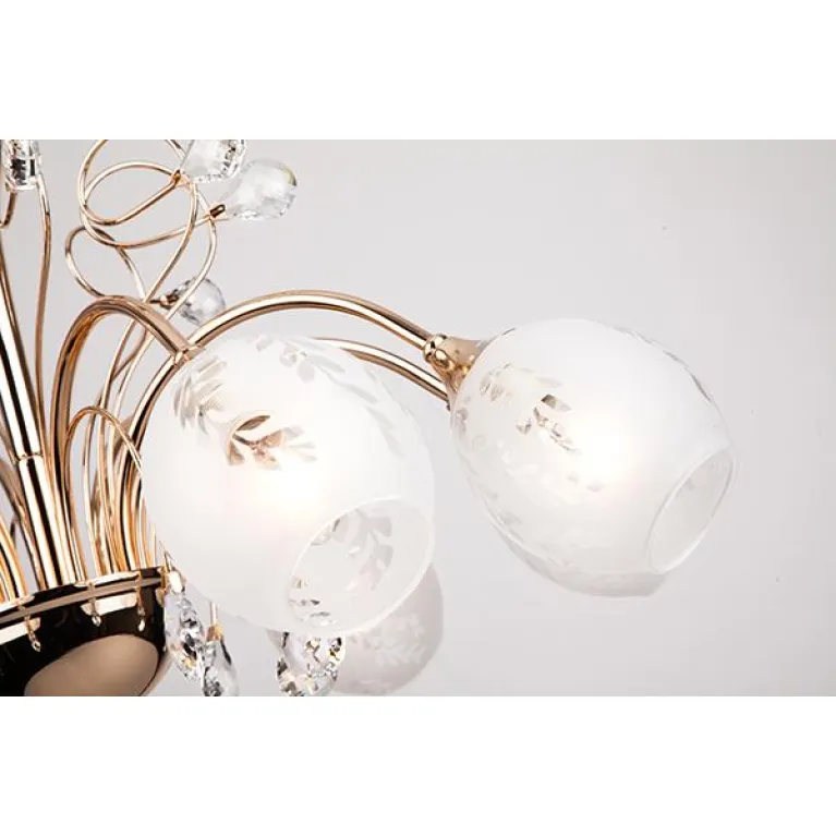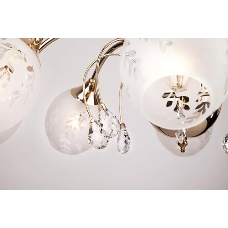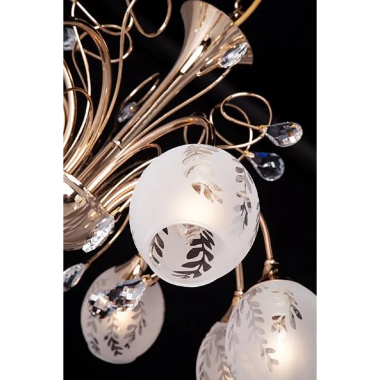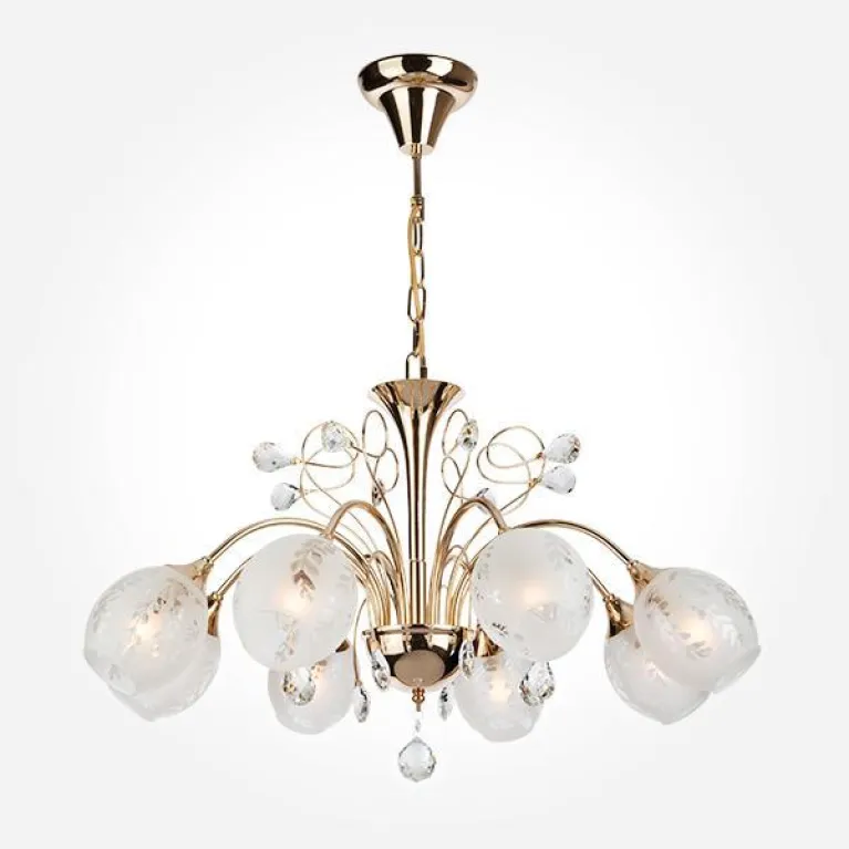 Преобладающий цвет люстры: Белый, плафонов: Белый, арматуры: Золото; материал изготовления арматуры: Металл, размеры, мм: / высота 430 / диаметр 710. Общая мощность – 480 Ватт, а максимальная площадь освещения до 26,7 м2. Основной тип ламп, предусмотренный производителем: Накаливания с цоколем E14. В зависимости от предпочтений можно использовать лампы теплового, холодного или нейтрального света, за исключением люстр с типом цоколя LED.