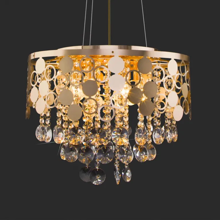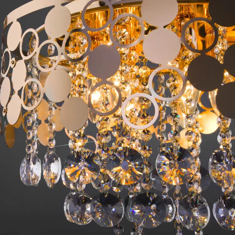 Основанием люстры служит изысканный металлический каркас золотого цвета, который прекрасно гармонирует с хрустальными элементами. Прозрачные подвески из хрусталя придают светильнику лёгкость и элегантность, обеспечивая яркое и красивое рассеивание света.