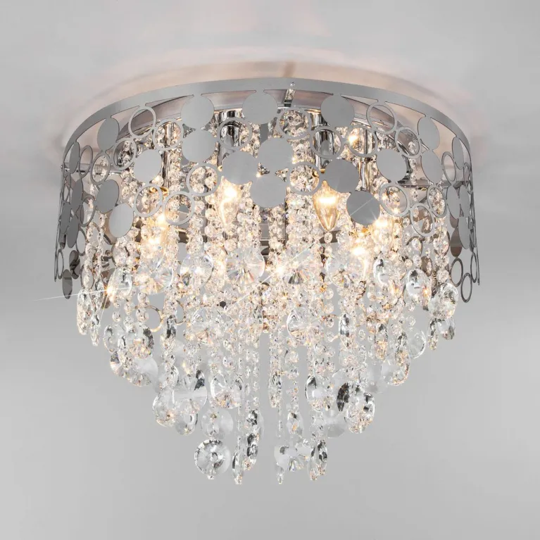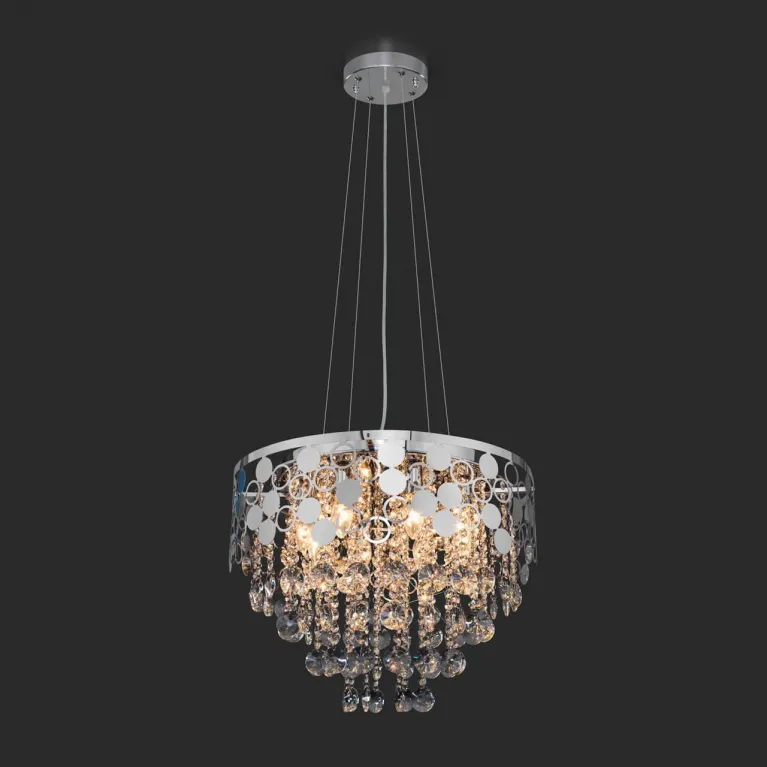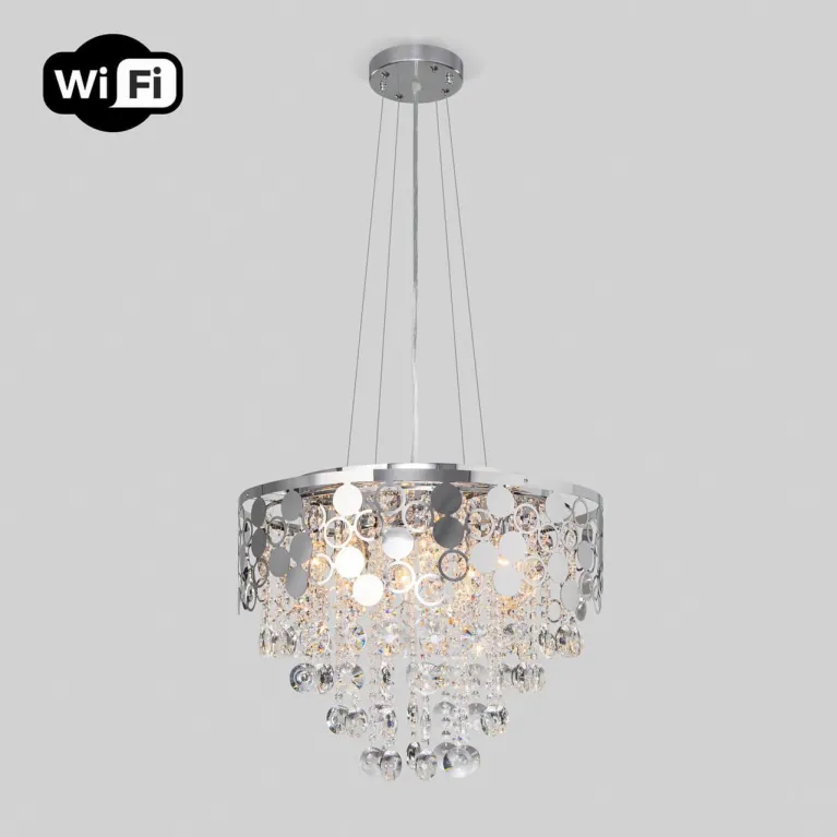 Люстра выполнена из качественных материалов, таких как металл и прозрачный хрусталь, и отличается современным дизайном и изящной хромированной отделкой. Она оснащена восемью лампами, что обеспечивает яркое и равномерное освещение пространства площадью до 48 кв.м. Лампы типа E14 позволяют использовать как традиционные, так и светодиодные источники света, предоставляя максимальную гибкость в выборе освещения.