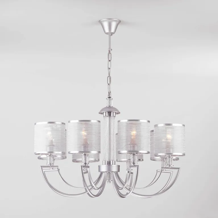 Преобладающий цвет люстры: Серебро, плафонов: Серебро, арматуры: Серебро; материал изготовления арматуры: Металл, размеры, мм: / высота 460 / диаметр 760. Общая мощность – 320 Ватт, а максимальная площадь освещения до 24 м2. Основной тип ламп, предусмотренный производителем: Накаливания с цоколем E14. В зависимости от предпочтений можно использовать лампы теплового, холодного или нейтрального света, за исключением люстр с типом цоколя LED.