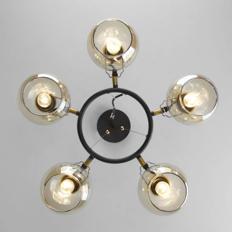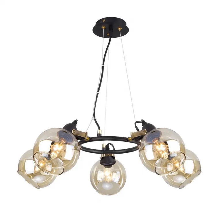 Преобладающий цвет люстры: Янтарный, плафонов: Янтарный, арматуры: Черный; материал изготовления арматуры: Металл, размеры, мм: / высота 200 / диаметр 600. Общая мощность – 300 Ватт, а максимальная площадь освещения до 15 м2. Основной тип ламп, предусмотренный производителем: Накаливания с цоколем E14. В зависимости от предпочтений можно использовать лампы теплового, холодного или нейтрального света, за исключением люстр с типом цоколя LED.