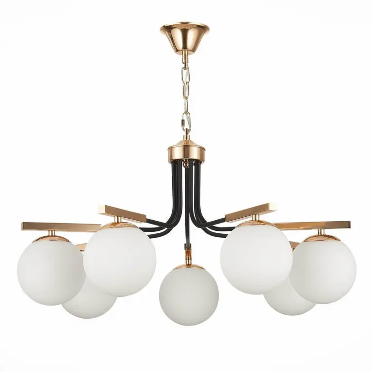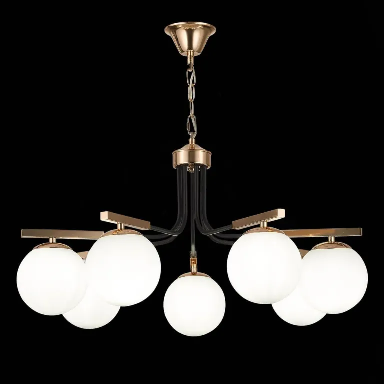 Люстра выполнена в современном дизайне и сочетает в себе простоту линий с утончённой отделкой. Основание сделано из прочного металла с черным матовым покрытием, которое прекрасно гармонирует с различными стилями интерьера. Плафоны из белого матового стекла обеспечивают мягкое и равномерное рассеивание света.