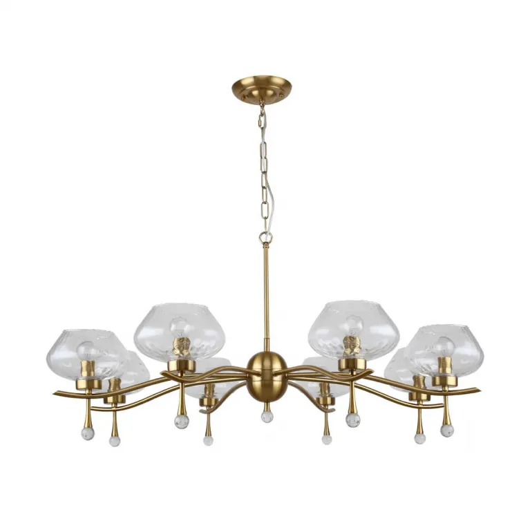 Люстра оснащена восемью источниками света с цоколем E14, что позволяет использовать лампы различного типа и мощности. Суммарная максимальная мощность ламп - 320 Вт, что обеспечивает яркое и равномерное освещение пространства площадью до 40 квадратных метров. Основание люстры выполнено из прочного металла и имеет эффектное хромированное покрытие, которое придает изделию современный и стильный вид.