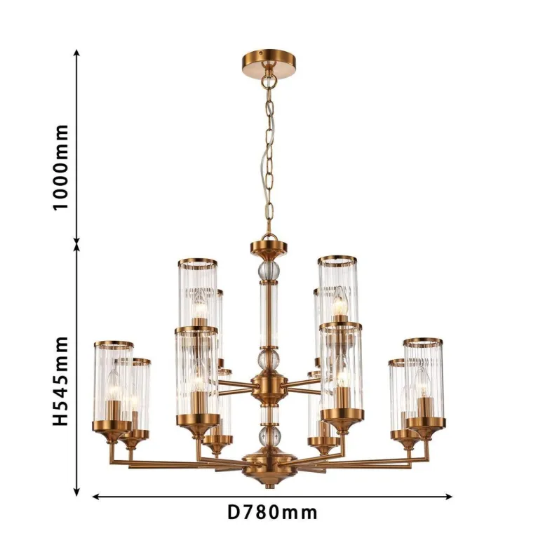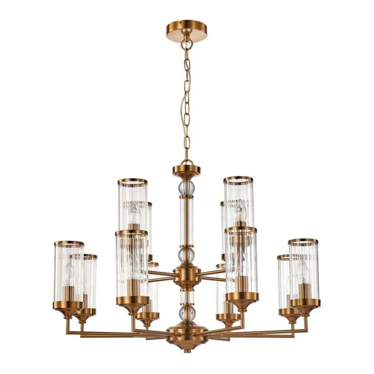 Люстра оснащена двенадцатью источниками света с цоколем E14, что позволяет использовать лампы накаливания, энергосберегающие или светодиодные. Максимальная мощность каждого источника света - 40 Вт, что обеспечивает достаточное освещение пространства площадью до 70 кв.м. Плафоны изготовлены из прочного матового стекла, которое прекрасно рассеивает свет и создает мягкое, приятное для глаз освещение.