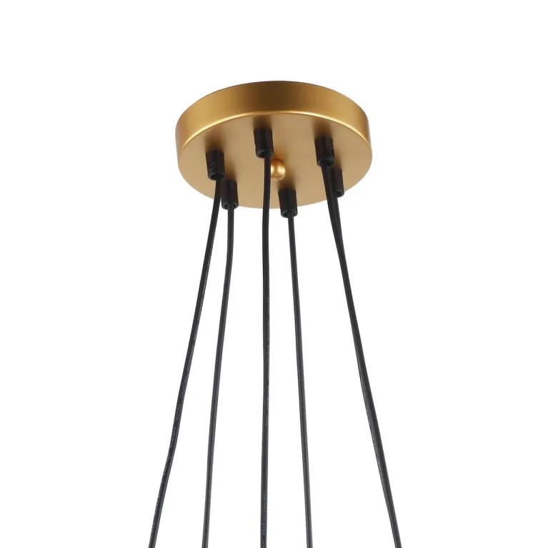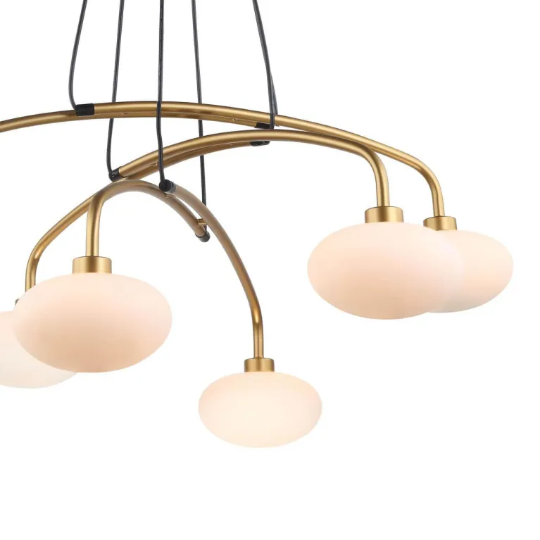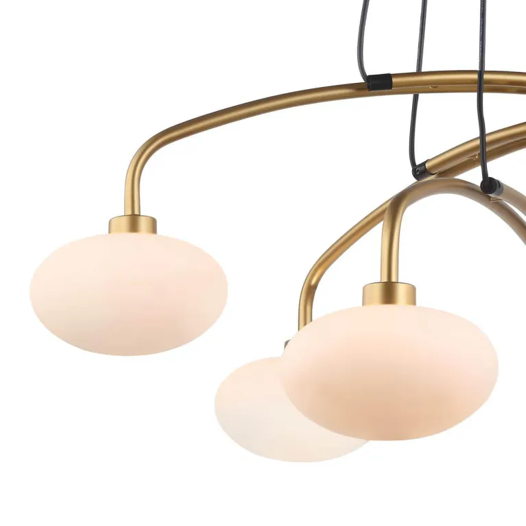 Преобладающий цвет люстры: Белый, плафонов: Белый, арматуры: Золото; материал изготовления арматуры: Металл, размеры, мм: / высота 300 / диаметр 700. Общая мощность – 150 Ватт. Основной тип ламп, предусмотренный производителем: Галогеновая с цоколем G9. В зависимости от предпочтений можно использовать лампы теплового, холодного или нейтрального света, за исключением люстр с типом цоколя LED.