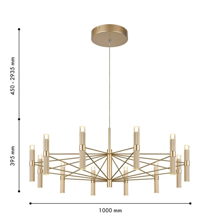 Преобладающий цвет плафонов: Золото, арматуры: Золото; материал изготовления арматуры: Металл, размеры, мм: / высота 2935 / диаметр 1000. Общая мощность – 84 Ватт, а максимальная площадь освещения до 18 м2. Основной тип ламп, предусмотренный производителем: Светодиодная с цоколем LED. В зависимости от предпочтений можно использовать лампы теплового, холодного или нейтрального света, за исключением люстр с типом цоколя LED.