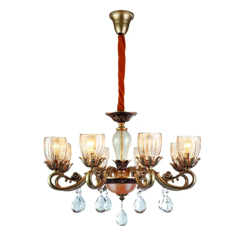 Преобладающий цвет люстры: Коричневый, плафонов: Янтарный, арматуры: Бронза; материал изготовления арматуры: Металл, размеры, мм: / высота 470 / диаметр 730. Общая мощность – 320 Ватт, а максимальная площадь освещения до 17,8 м2. Основной тип ламп, предусмотренный производителем: Накаливания с цоколем E14. В зависимости от предпочтений можно использовать лампы теплового, холодного или нейтрального света, за исключением люстр с типом цоколя LED.