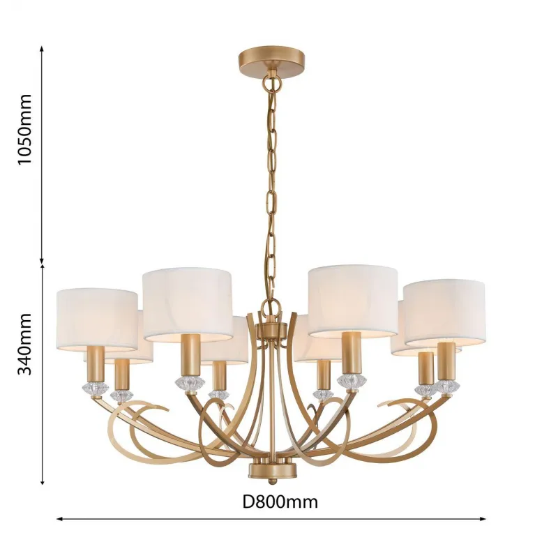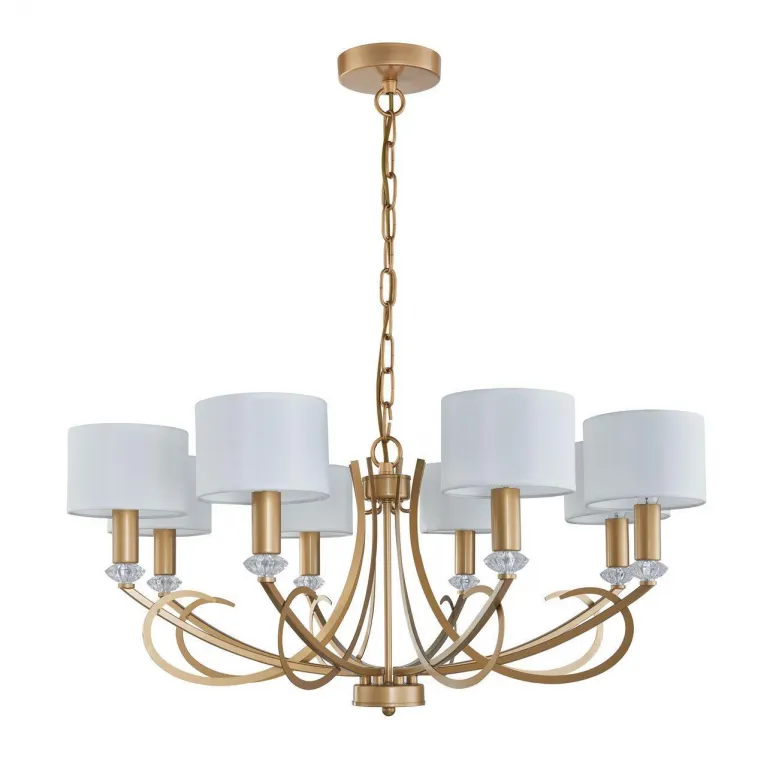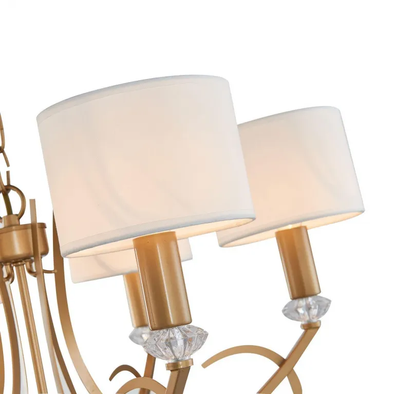 Преобладающий цвет люстры: Белый, плафонов: Белый, арматуры: Золото; материал изготовления арматуры: Металл, размеры, мм: / высота 340 / диаметр 800. Общая мощность – 320 Ватт. Основной тип ламп, предусмотренный производителем: Накаливания с цоколем E14. В зависимости от предпочтений можно использовать лампы теплового, холодного или нейтрального света, за исключением люстр с типом цоколя LED.