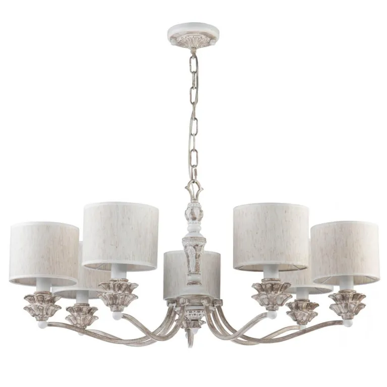 Люстра оснащена семью патронами E14, что позволяет использовать лампы мощностью до 40 Вт. Это обеспечивает яркое и равномерное освещение пространства, создавая уютную атмосферу в помещении. Основание выполнено из прочного металла, что гарантирует долговечность и надежность конструкции.