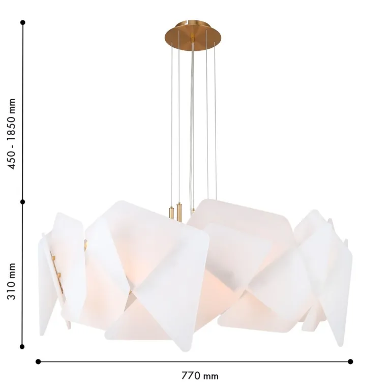 Преобладающий цвет плафонов: Белый, арматуры: Латунь; материал изготовления арматуры: Металл, размеры, мм: / высота 1850 / диаметр 800. Общая мощность – 320 Ватт, а максимальная площадь освещения до 16 м2. Основной тип ламп, предусмотренный производителем: Накаливания с цоколем E14. В зависимости от предпочтений можно использовать лампы теплового, холодного или нейтрального света, за исключением люстр с типом цоколя LED.