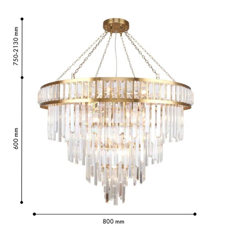 Преобладающий цвет плафонов: Прозрачный, арматуры: Латунь; материал изготовления арматуры: Металл, размеры, мм: / высота 2130 / диаметр 800. Общая мощность – 760 Ватт, а максимальная площадь освещения до 38 м2. Основной тип ламп, предусмотренный производителем: Накаливания с цоколем E14. В зависимости от предпочтений можно использовать лампы теплового, холодного или нейтрального света, за исключением люстр с типом цоколя LED.