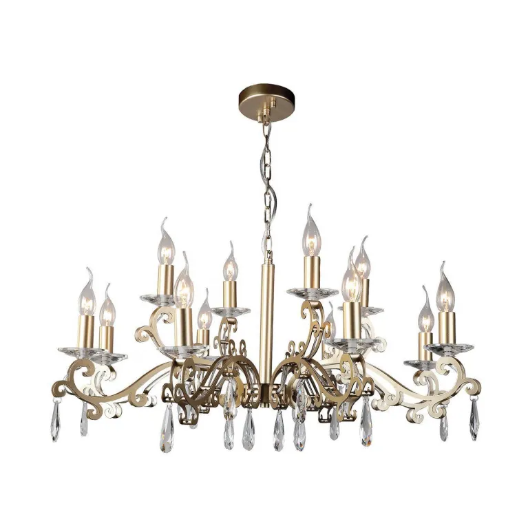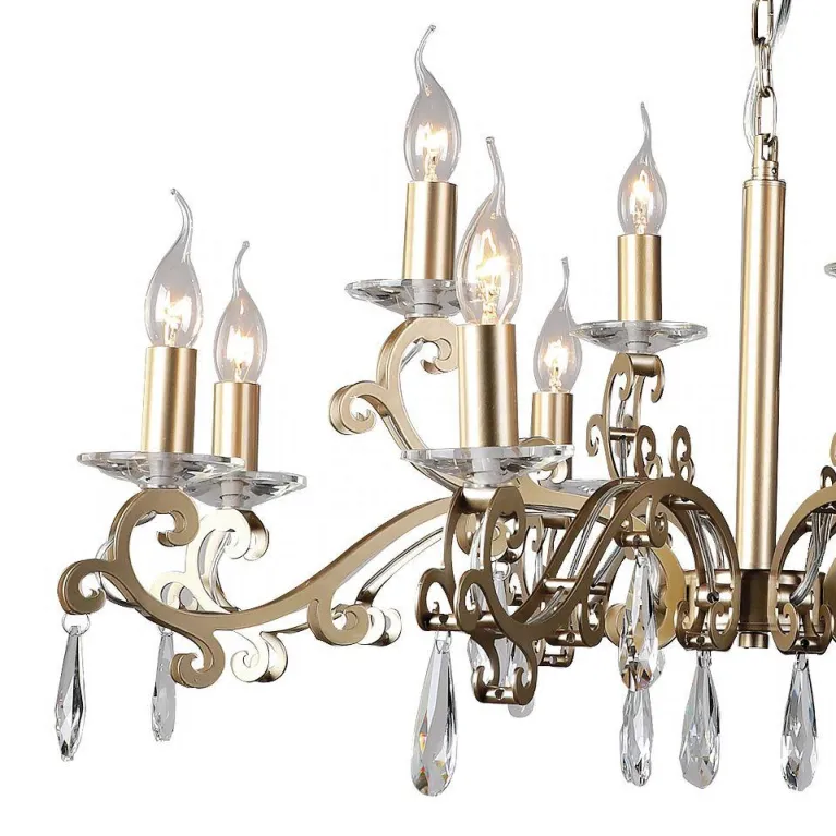 Преобладающий цвет люстры: Золотой, арматуры: Золото; материал изготовления арматуры: Металл, размеры, мм: / высота 450 / диаметр 850. Общая мощность – 480 Ватт, а максимальная площадь освещения до 26,7 м2. Основной тип ламп, предусмотренный производителем: Накаливания с цоколем E14. В зависимости от предпочтений можно использовать лампы теплового, холодного или нейтрального света, за исключением люстр с типом цоколя LED.