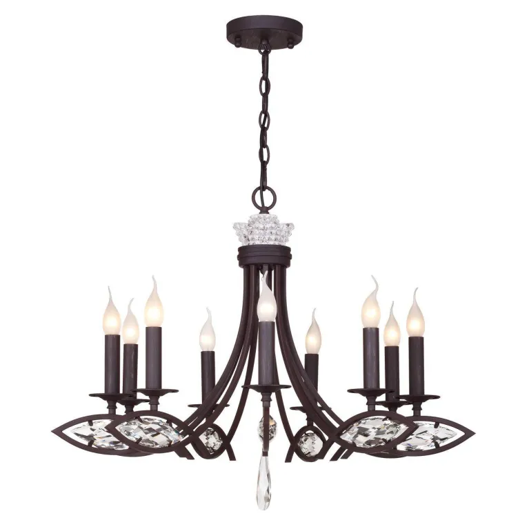 Преобладающий цвет люстры: Коричневый, арматуры: Коричневый; материал изготовления арматуры: Металл, размеры, мм: / высота 540 / диаметр 800. Общая мощность – 360 Ватт, а максимальная площадь освещения до 20 м2. Основной тип ламп, предусмотренный производителем: Накаливания с цоколем E14. В зависимости от предпочтений можно использовать лампы теплового, холодного или нейтрального света, за исключением люстр с типом цоколя LED.