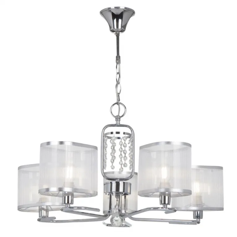 Преобладающий цвет люстры: Серебро, плафонов: Серебро, арматуры: Хром; материал изготовления арматуры: Металл, размеры, мм: / высота 335 / диаметр 600. Общая мощность – 200 Ватт. Основной тип ламп, предусмотренный производителем: Накаливания с цоколем E14. В зависимости от предпочтений можно использовать лампы теплового, холодного или нейтрального света, за исключением люстр с типом цоколя LED.