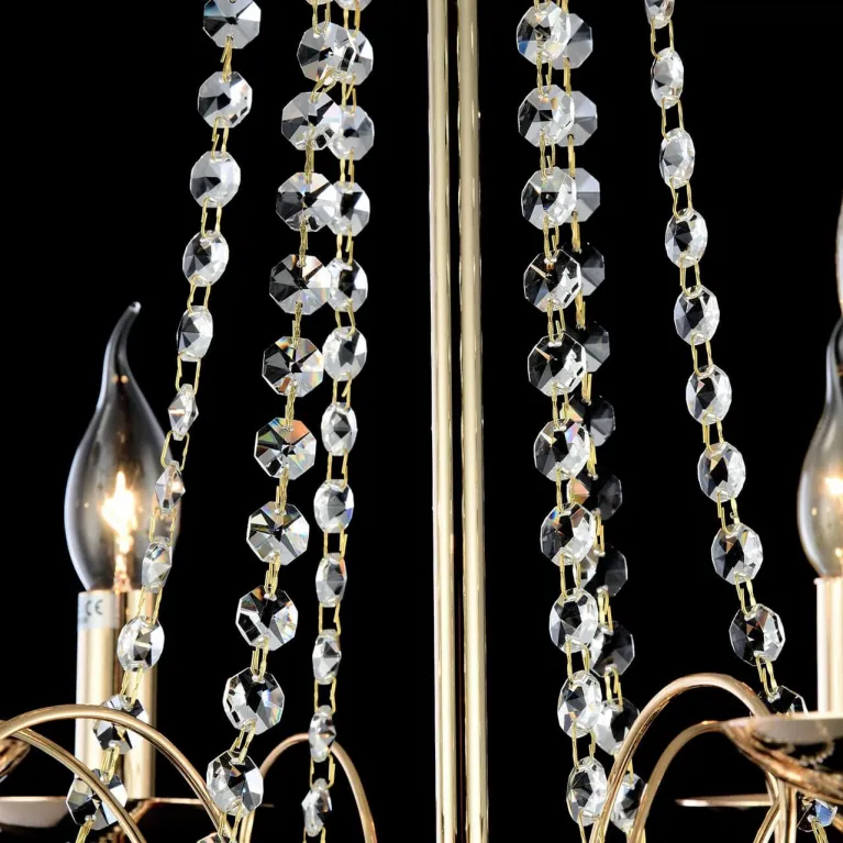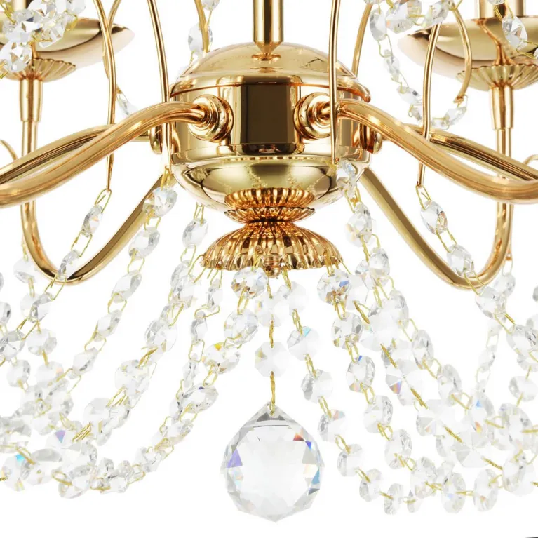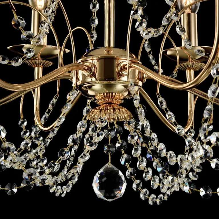 Преобладающий цвет люстры: Золотой, арматуры: Золото; материал изготовления арматуры: Металл, размеры, мм: / высота 465 / диаметр 580. Общая мощность – 360 Ватт, а максимальная площадь освещения до 20 м2. Основной тип ламп, предусмотренный производителем: Накаливания с цоколем E14. В зависимости от предпочтений можно использовать лампы теплового, холодного или нейтрального света, за исключением люстр с типом цоколя LED.