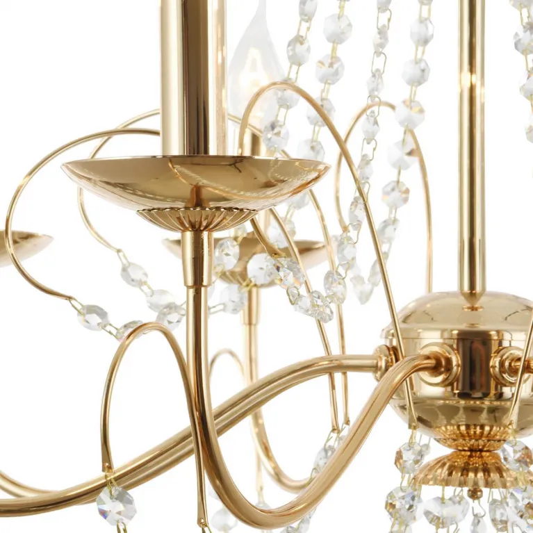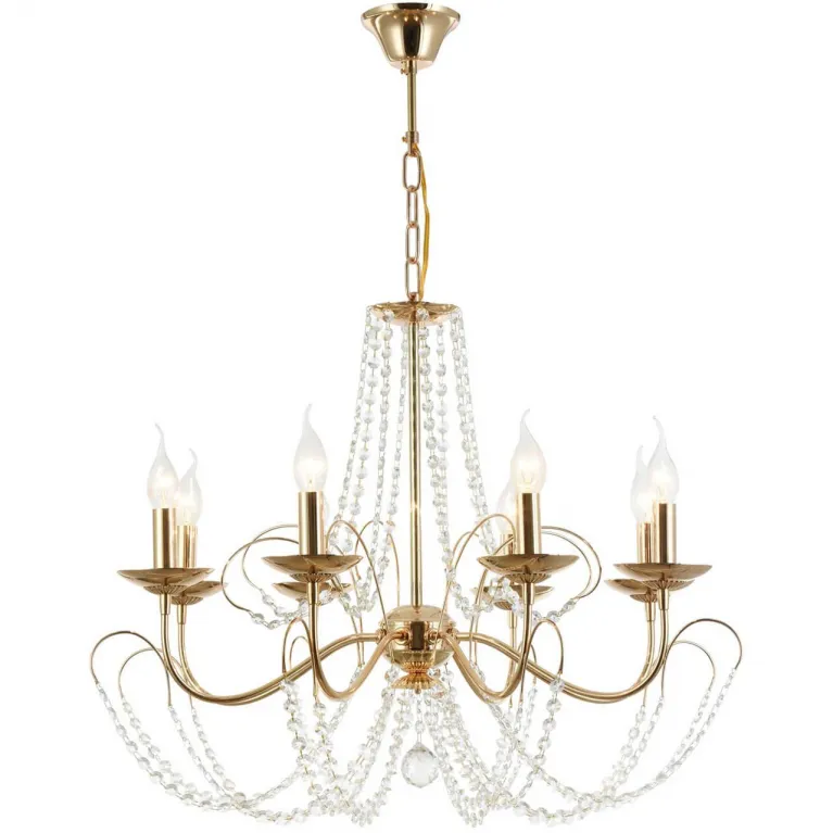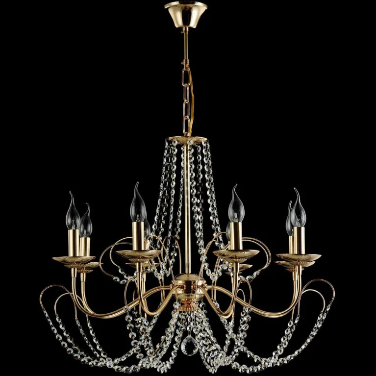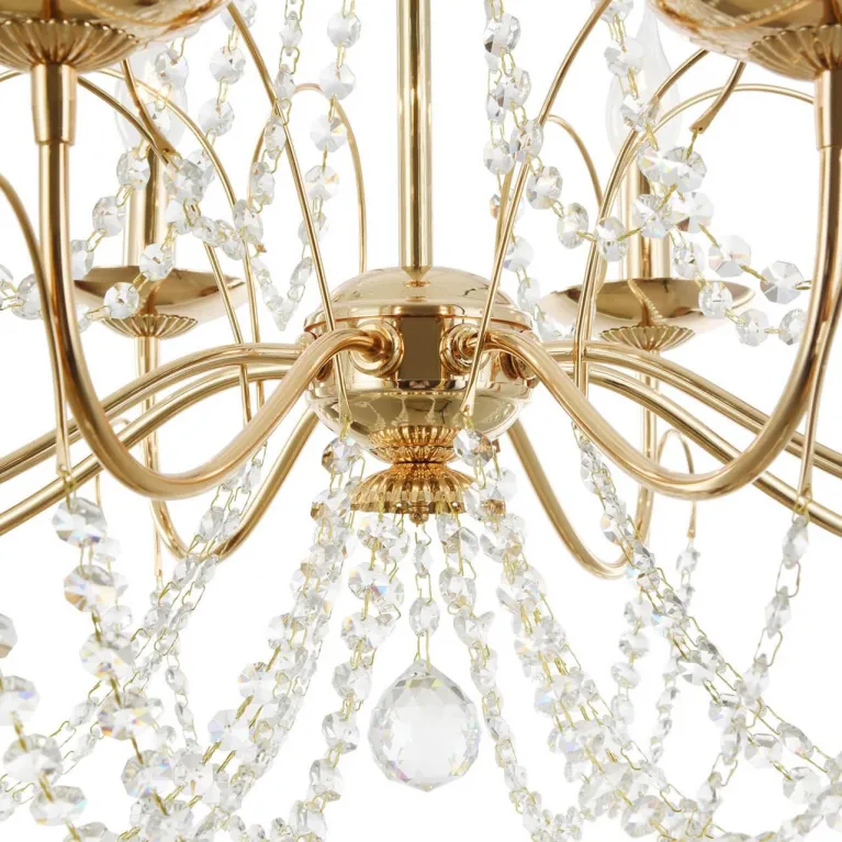 Преобладающий цвет люстры: Золотой, арматуры: Золото; материал изготовления арматуры: Металл, размеры, мм: / высота 550 / диаметр 710. Общая мощность – 480 Ватт, а максимальная площадь освещения до 26,7 м2. Основной тип ламп, предусмотренный производителем: Накаливания с цоколем E14. В зависимости от предпочтений можно использовать лампы теплового, холодного или нейтрального света, за исключением люстр с типом цоколя LED.