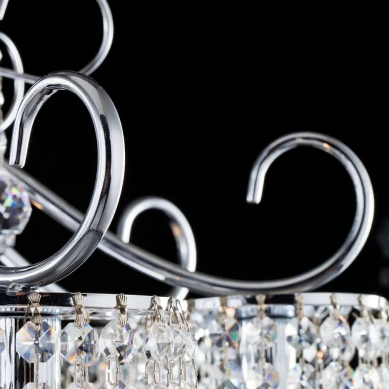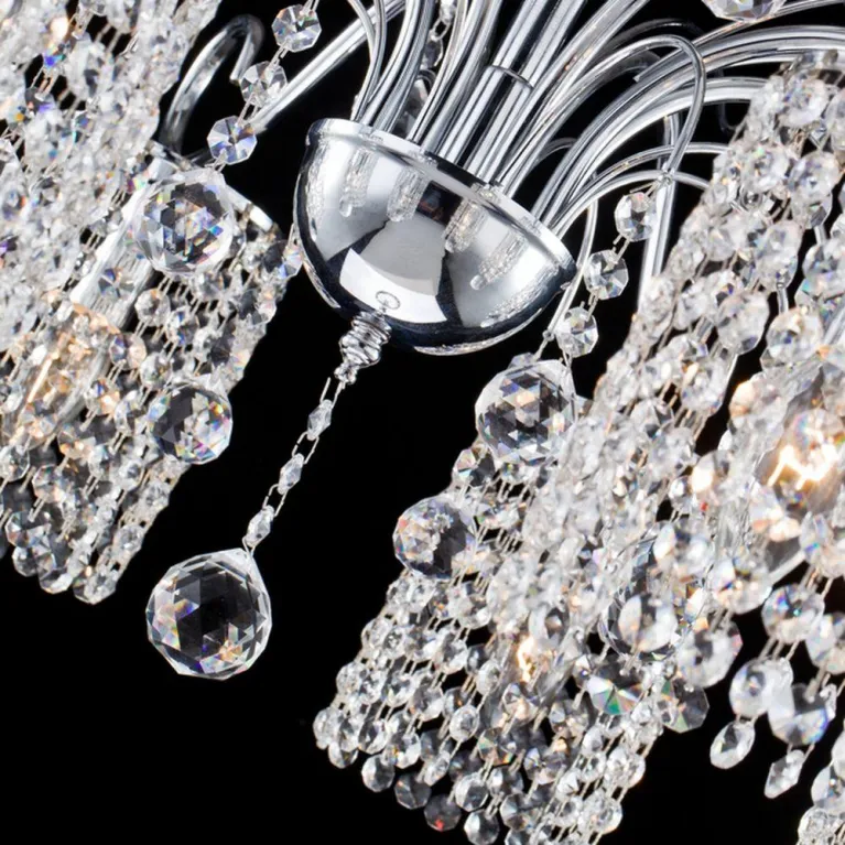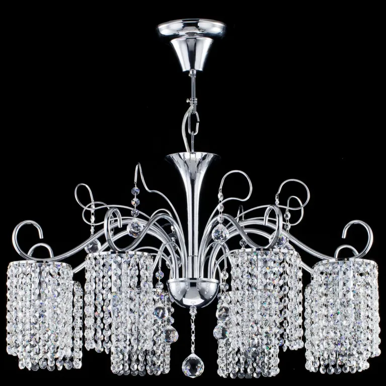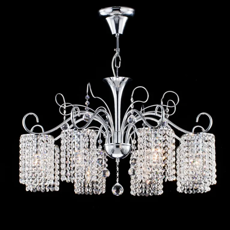 Преобладающий цвет люстры: Хром, плафонов: Прозрачный, арматуры: Хром; материал изготовления арматуры: Металл, размеры, мм: / высота 860 / диаметр 735. Общая мощность – 480 Ватт, а максимальная площадь освещения до 26,7 м2. Основной тип ламп, предусмотренный производителем: Накаливания с цоколем E27. В зависимости от предпочтений можно использовать лампы теплового, холодного или нейтрального света, за исключением люстр с типом цоколя LED.