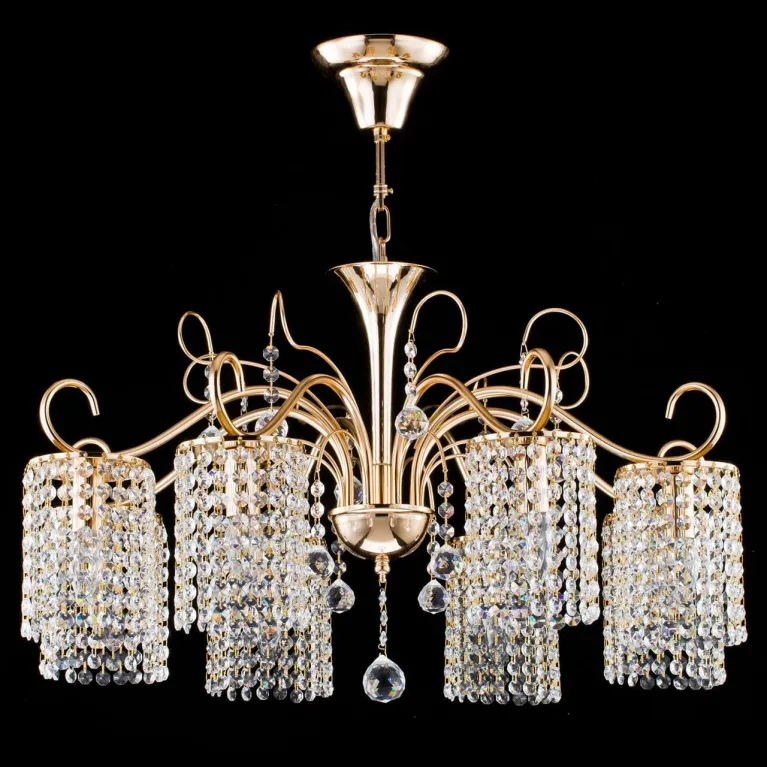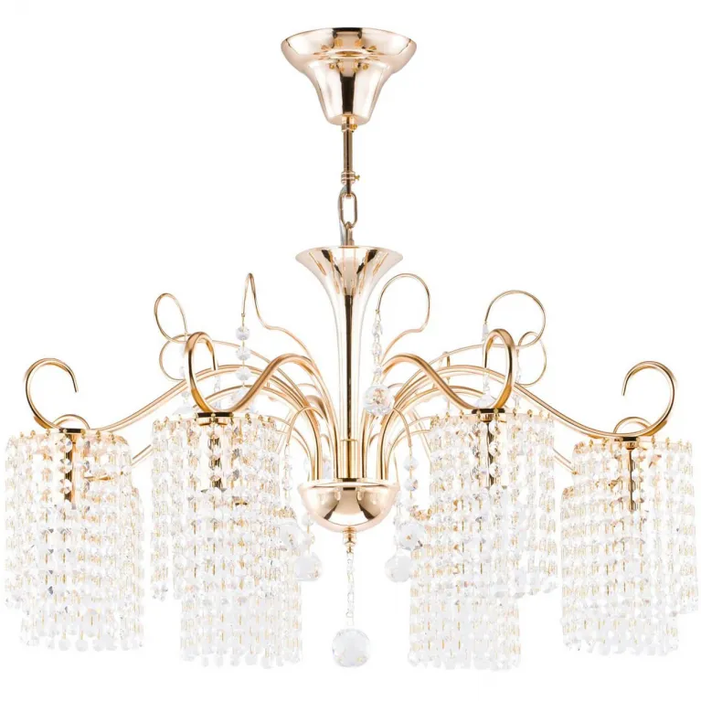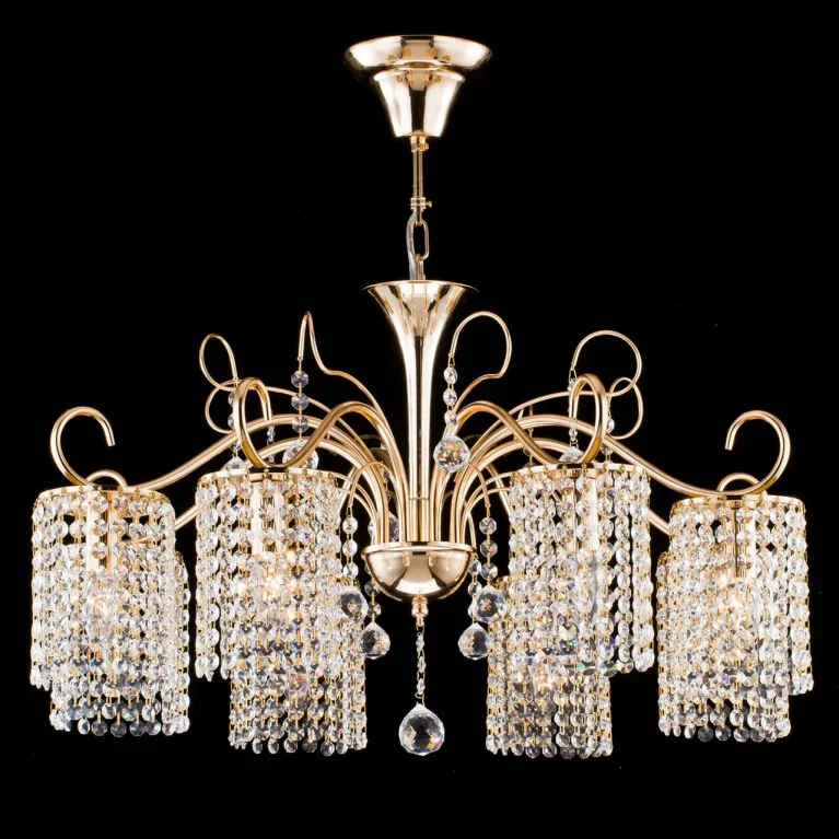 Люстра изготовлена из прочного металла с гальваническим покрытием золотого цвета, что придаёт ей роскошный и утончённый вид. Плафоны из белого матового стекла обеспечивают мягкое и равномерное рассеивание света, создавая приятное освещение в помещении.