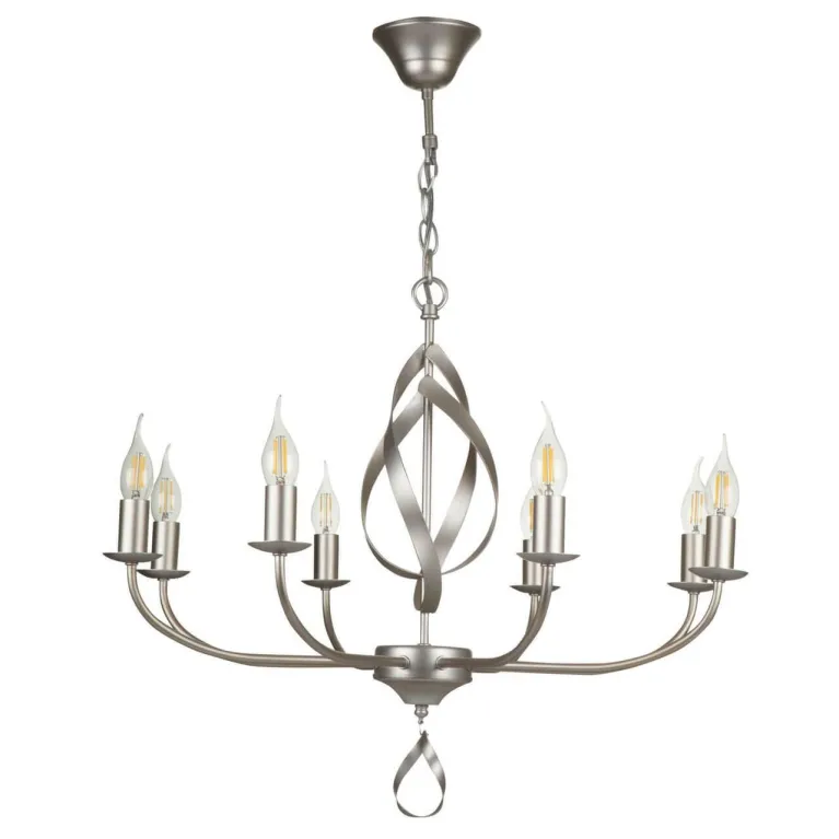 Преобладающий цвет люстры: Серебро, арматуры: Серебро; материал изготовления арматуры: Металл, размеры, мм: / высота 528 / диаметр 670. Общая мощность – 320 Ватт. Основной тип ламп, предусмотренный производителем: Накаливания с цоколем E14. В зависимости от предпочтений можно использовать лампы теплового, холодного или нейтрального света, за исключением люстр с типом цоколя LED.