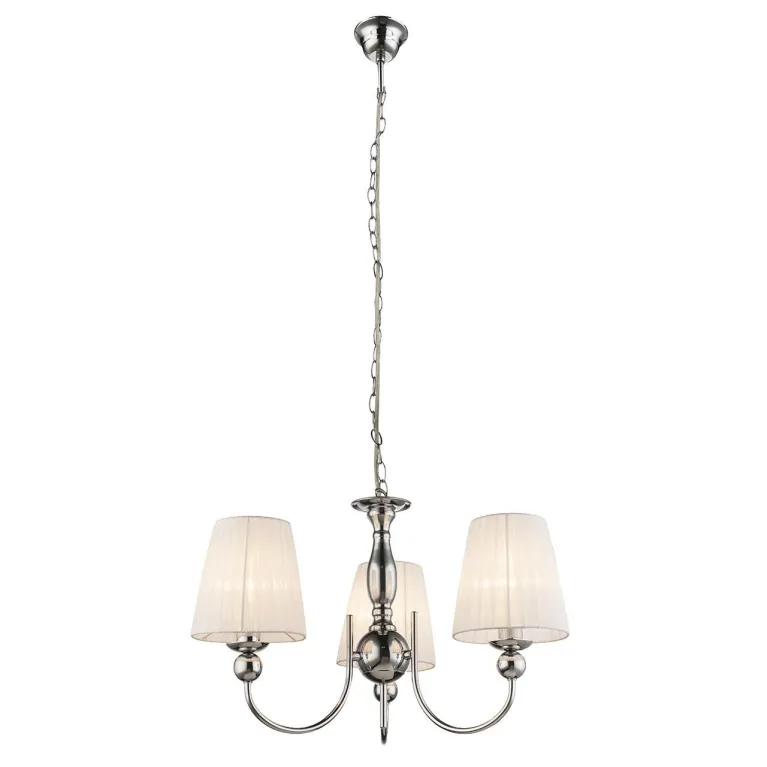Преобладающий цвет люстры: Белый, плафонов: Белый, арматуры: Хром; материал изготовления арматуры: Металл, размеры, мм: / высота 1200 / диаметр 560. Общая мощность – 120 Ватт, а максимальная площадь освещения до 6,7 м2. Основной тип ламп, предусмотренный производителем: Накаливания с цоколем E14. В зависимости от предпочтений можно использовать лампы теплового, холодного или нейтрального света, за исключением люстр с типом цоколя LED.