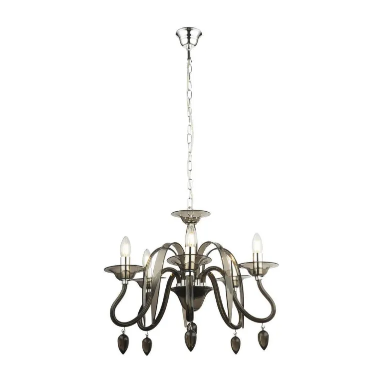 Преобладающий цвет люстры: Дымчатый, арматуры: Хром; материал изготовления арматуры: Металл, размеры, мм: / высота 1180 / диаметр 530. Общая мощность – Ватт. Основной тип ламп, предусмотренный производителем: Накаливания с цоколем E14. В зависимости от предпочтений можно использовать лампы теплового, холодного или нейтрального света, за исключением люстр с типом цоколя LED.