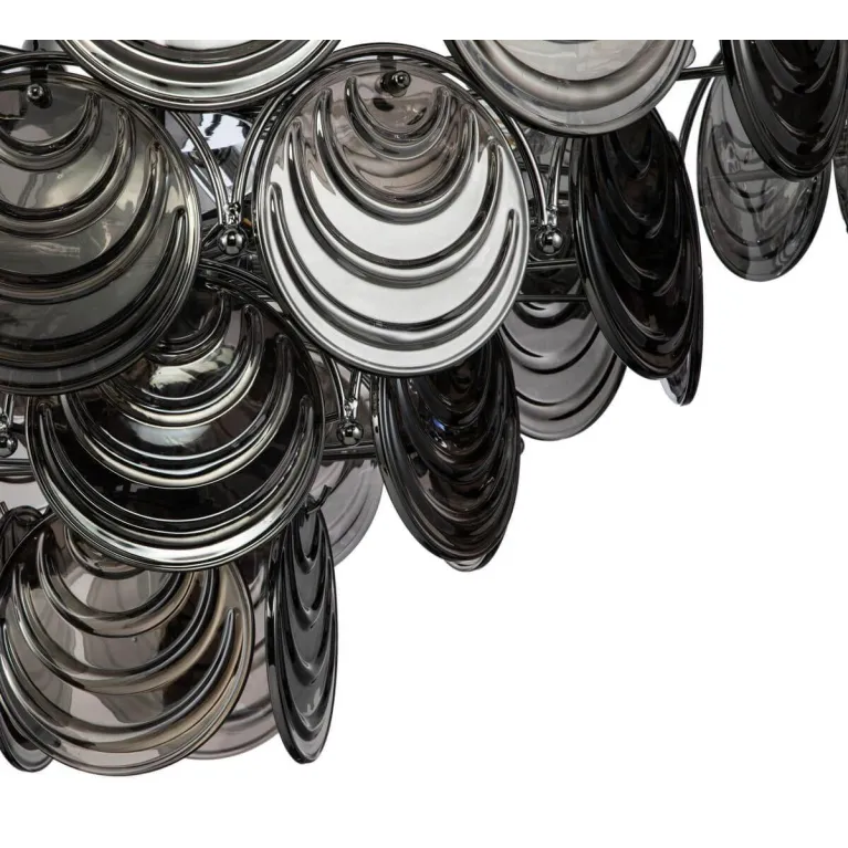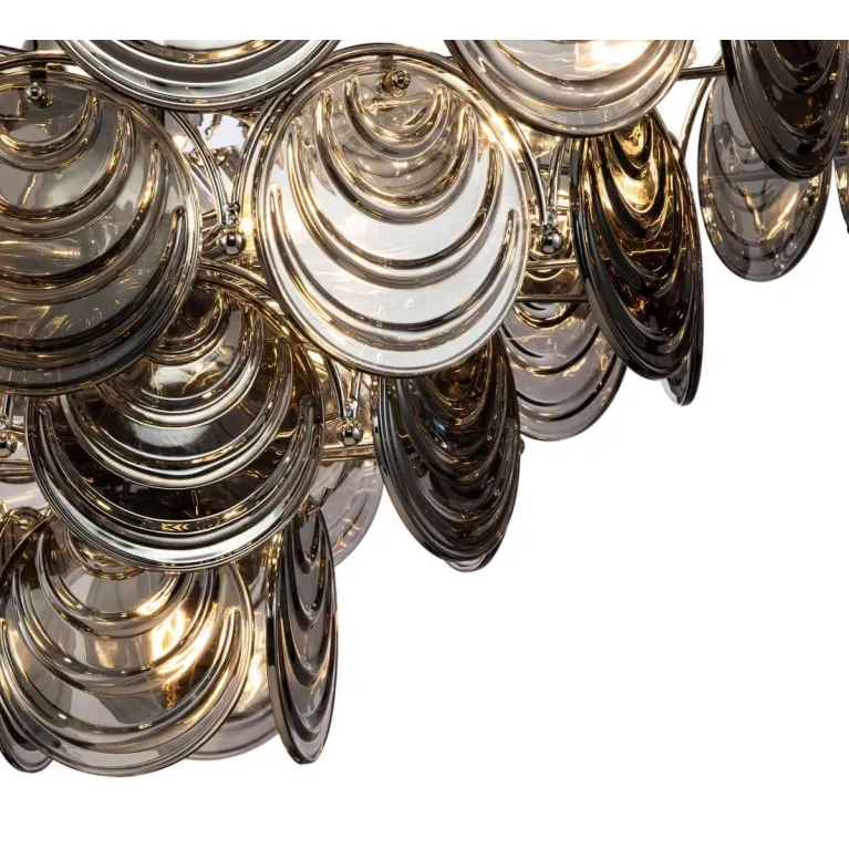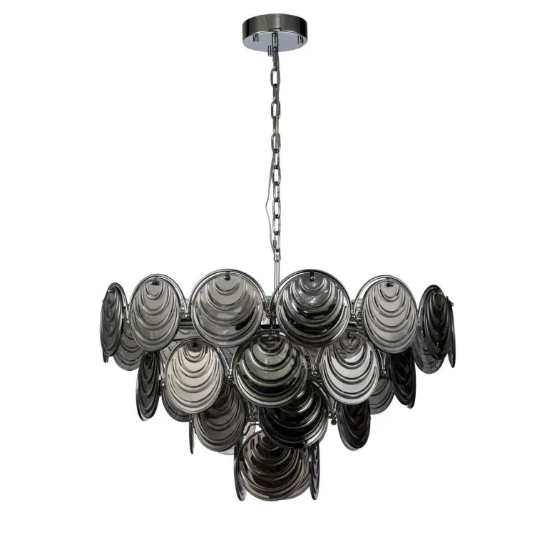 Преобладающий цвет люстры: Дымчатый, плафонов: Дымчатый, арматуры: Хром; материал изготовления арматуры: Металл, размеры, мм: / высота 490 / диаметр 800. Общая мощность – 520 Ватт. Основной тип ламп, предусмотренный производителем: Накаливания с цоколем E14. В зависимости от предпочтений можно использовать лампы теплового, холодного или нейтрального света, за исключением люстр с типом цоколя LED.