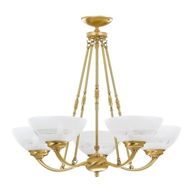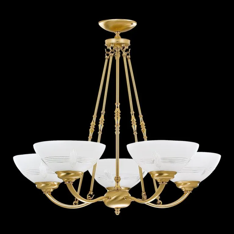 Преобладающий цвет люстры: Белый, плафонов: Белый, арматуры: Золото; материал изготовления арматуры: Латунь, размеры, мм: / высота 680 / диаметр 760. Общая мощность – 200 Ватт. Основной тип ламп, предусмотренный производителем: Накаливания с цоколем E27. В зависимости от предпочтений можно использовать лампы теплового, холодного или нейтрального света, за исключением люстр с типом цоколя LED.