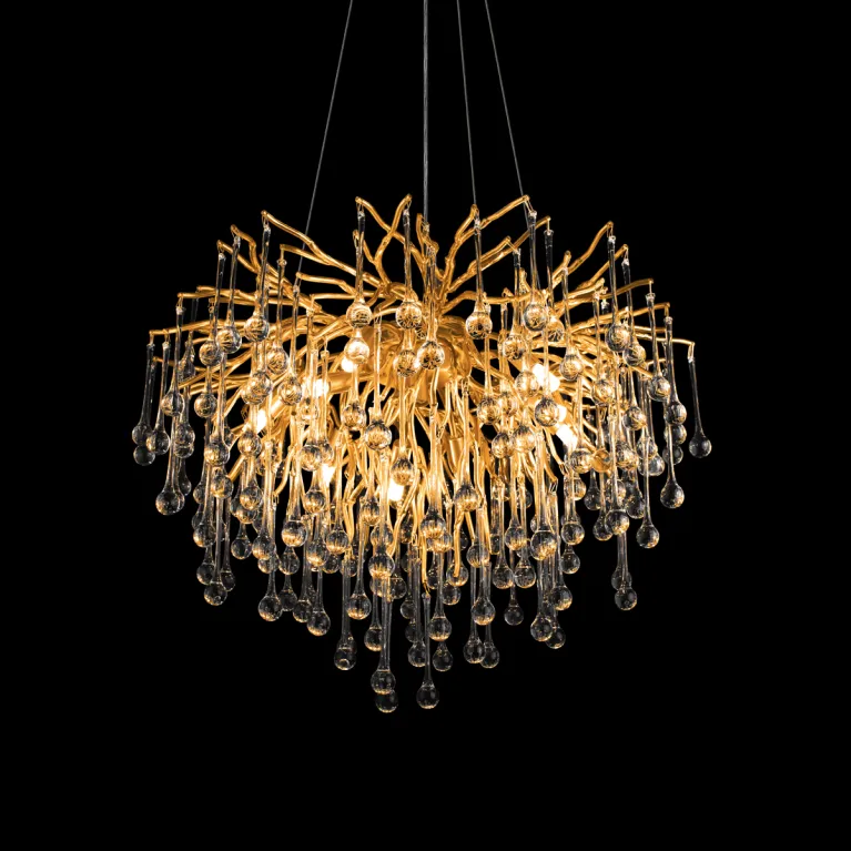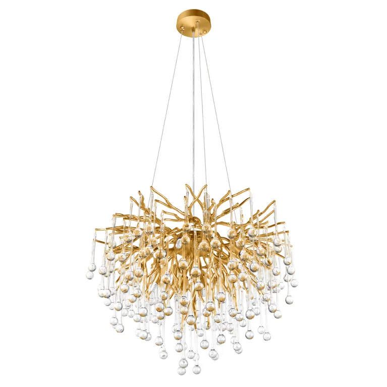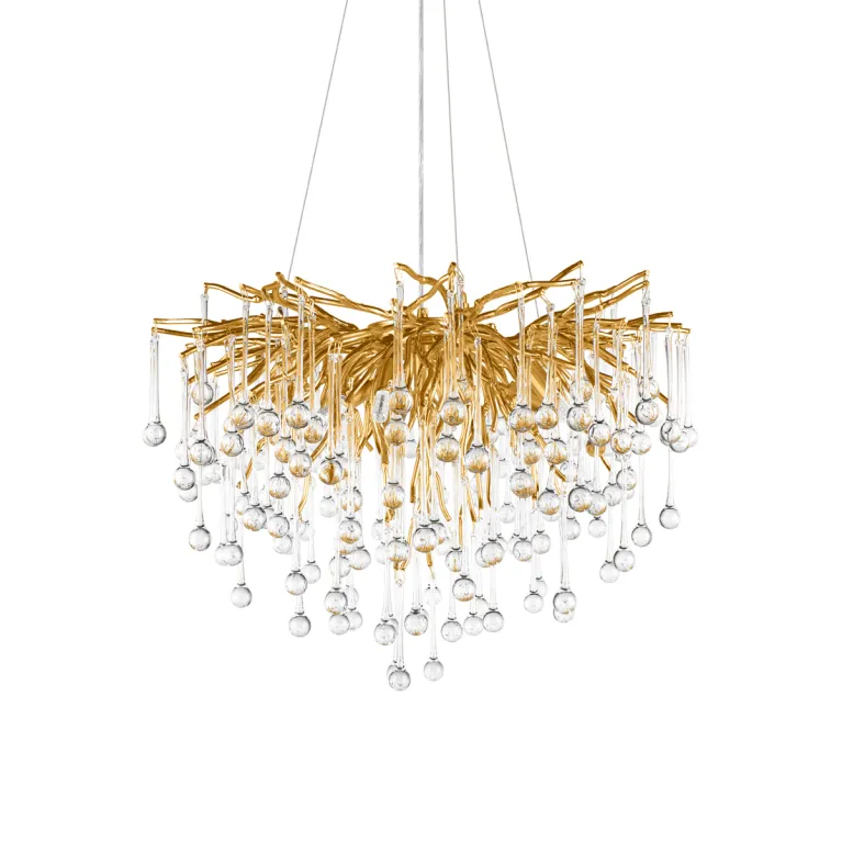 Преобладающий цвет плафонов: Прозрачный, арматуры: Золото; материал изготовления арматуры: Металл, размеры, мм: / высота 3480 / диаметр 600. Общая мощность – 50 Ватт. Основной тип ламп, предусмотренный производителем: Светодиодная с цоколем G9. В зависимости от предпочтений можно использовать лампы теплового, холодного или нейтрального света, за исключением люстр с типом цоколя LED.
