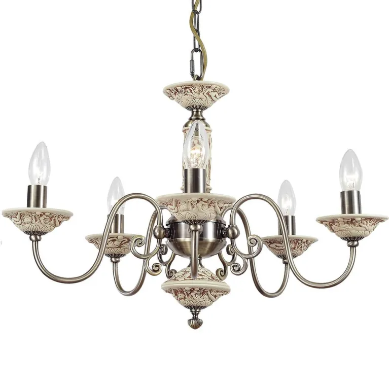 Светильник оснащен пятью источниками света с цоколем E14, что позволяет использовать различные типы ламп, включая энергосберегающие и светодиодные. Максимальная мощность ламп — 60 Вт, что обеспечивает достаточное освещение пространства площадью до 30 квадратных метров.