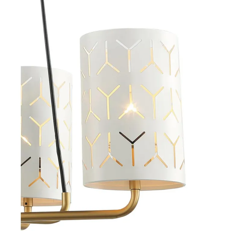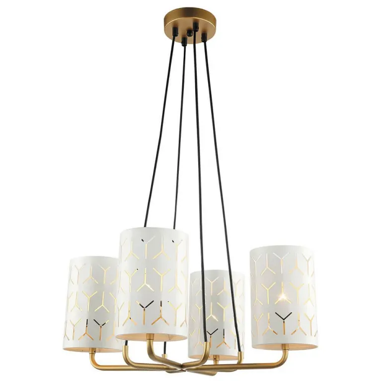 Преобладающий цвет люстры: Белый, плафонов: Белый, арматуры: Золото; материал изготовления арматуры: Металл, размеры, мм: длина 550 / ширина 550 / высота 800 Общая мощность – 240 Ватт, а максимальная площадь освещения до 12 м2. Основной тип ламп, предусмотренный производителем: Накаливания с цоколем E27. В зависимости от предпочтений можно использовать лампы теплового, холодного или нейтрального света, за исключением люстр с типом цоколя LED.