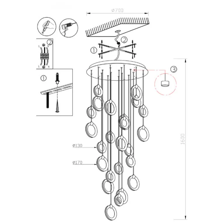 Люстра изготовлена из качественных материалов, которые обеспечивают долговечность и надёжность конструкции. Регулируемая длина подвеса позволяет адаптировать люстру под различные типы потолков, включая натяжные, подвесные и бетонные.